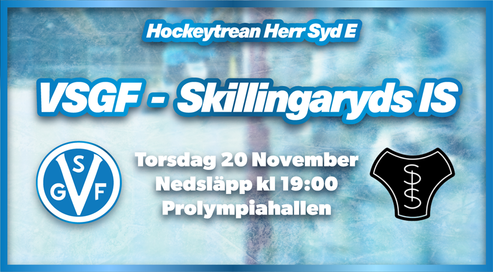 Ishockey i Prolympiahallen i kvÀll. Virserums SGF tar emot Skillingaryd. Matchstart: 19.00 Plats: Prolympiahallen, Virserum Kiosken Àr öppen. VÀlkommen till hallen och till kvÀllens seriematch i Hockeytrean Herr Syd E