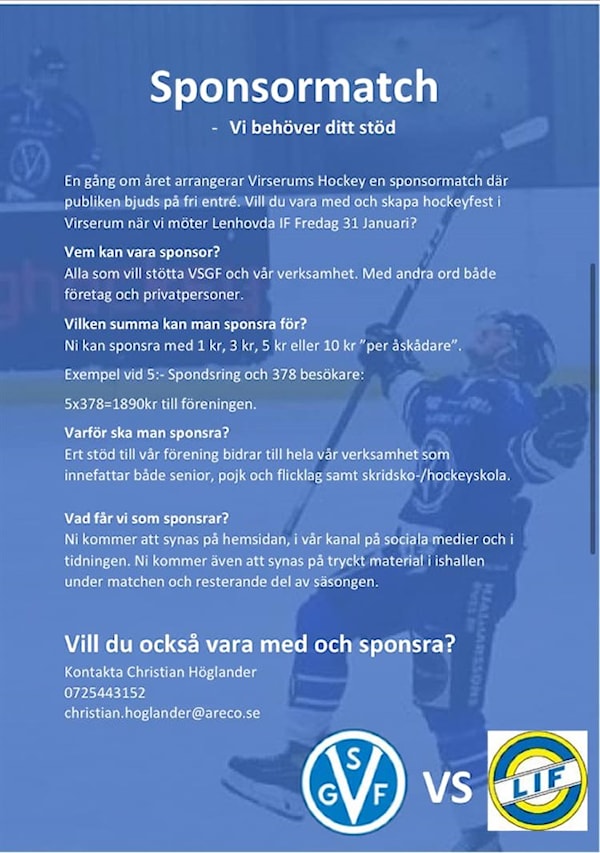 Ypperligt tillfälle för alla att stötta föreningen rent ekonomiskt och samtidigt öppna dörren för att alla kan ha möjlighet och se denna match gratis. Då alla sponsorer är med och bidrar till fri entré och publikfest.